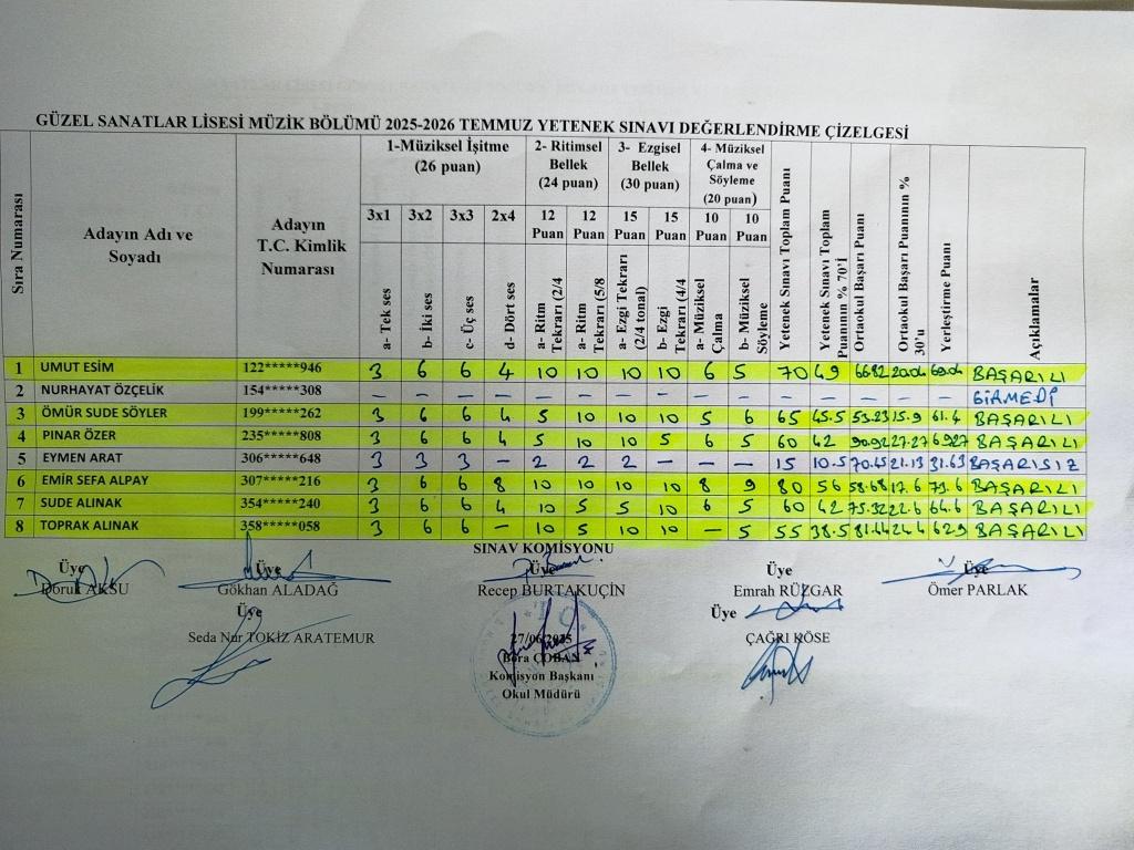 2025-2026 1.Yetenek Sınavı Sonuçları (Müzik Bölümü)